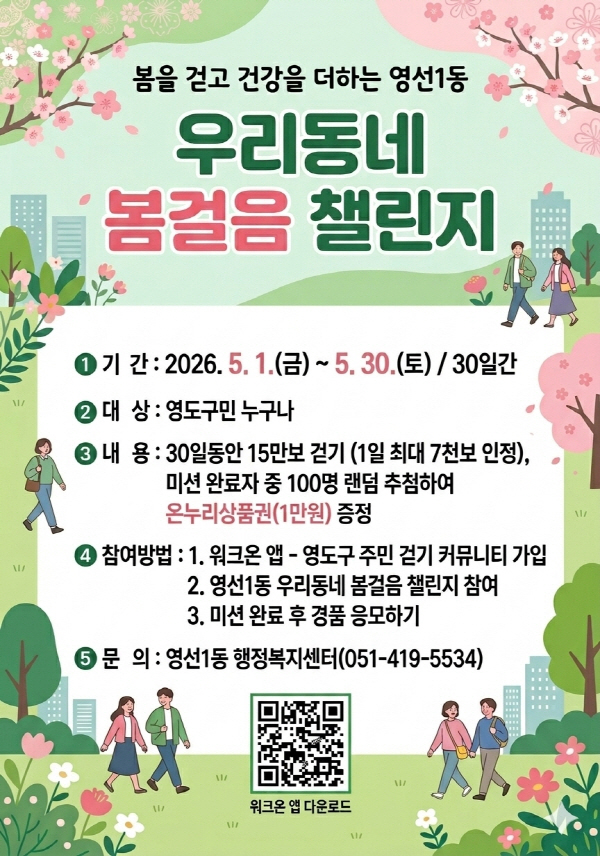 縰Áö Âü¿© ¹æ¹ýÀº °£´ÜÇÏ´Ù. Âü¿©ÀÚ´Â ½º¸¶Æ®Æù¿¡ ¡®¿öÅ©¿Â¡¯ ¾ÛÀ» ¼³Ä¡ÇÑ µÚ ¡®¿µµµ±¸º¸°Ç¼Ò °ø½Ä °È±â Ä¿¹Â´ÏƼ¡¯¿¡ °¡ÀÔÇϰí, ¡®¿ì¸®µ¿³× º½°ÉÀ½ 縰Áö¡¯¿¡ Âü¿©ÇÏ¸é µÈ´Ù. 縰Áö ±â°£ µ¿¾È ´©Àû 15¸¸ º¸ ´Þ¼º(1ÀÏ ÃÖ´ë 7õ º¸ ÀÎÁ¤)À» ¸ñÇ¥·Î Çϸç, ¸ñÇ¥ ´Þ¼ºÀÚ Áß 100¸íÀ» ¹«ÀÛÀ§ ÃßÃ·ÇØ ¿Â´©¸®»óǰ±Ç(1¸¸ ¿ø±Ç)À» Áö±ÞÇÒ ¿¹Á¤ÀÌ´Ù.