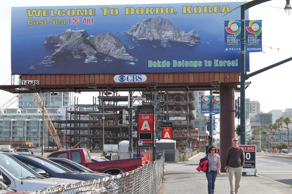 14ÀÏ ¹ã(ÇöÁö½Ã°£)¿¡ ¼¼¿öÁø ÀÌ ±¤°íÆÇ¿¡´Â »ó°ø¿¡¼ ÂïÀº µ¶µµ Àü°æÀ» ¹è°æÀ¸·Î 'Çѱ¹ÀÇ µ¶µµ¿¡ ¿À½Å °ÍÀ» ȯ¿µÇÕ´Ï´Ù'(WELCOME TO DOKDO, KOREA), 'µ¿ÇØ'(East Sea)¶ó°í ÀûÇô ÀÖ´Ù. ¶Ç ÇÏ´Ü¿¡´Â 'µ¶µµ´Â Çѱ¹ÀÇ ¿µÅäÀÔ´Ï´Ù'(Dokdo Belongs to Korea!)¶ó°í µÅ ÀÖ´Ù.