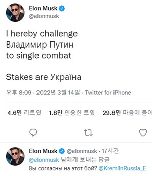 ·¯½Ã¾ÆÀÇ ¿ìÅ©¶óÀ̳ª ħ°ø ÀÌÈÄ Åë½Å¸Á ºØ±«¸¦ ¸·°íÀÚ ¿ìÅ©¶óÀ̳ª¿¡ À§¼º ÀÎÅÍ³Ý ½ºÅ¸¸µÅ© ¼ºñ½º¸¦ Áö¿øÇß´ø Å×½½¶ó ÃÖ°í°æ¿µÀÚ(CEO) ÀÏ·Ð ¸Ó½ºÅ©°¡ À̹ø¿£ ºí¶óµð¹Ì¸£ Ǫƾ ·¯½Ã¾Æ ´ëÅë·É¿¡ ¡®ÀÏ´ëÀÏ °áÅõ¡¯¸¦ ½ÅûÇß´Ù.