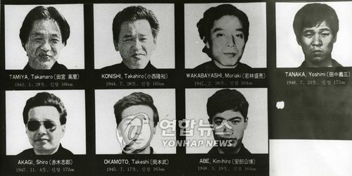 1970³â3¿ù30ÀÏ ½Â°´ ¹× ½Â¹«¿ø 129¸íÀ» ½ÇÀº ä µµÄì¿¡¼ ÈÄÄí¿ÀÄ«(ÜØËª)·Î ÇâÇÏ´ø ÀϺ»Ç×°ø(JAL) ¿äµµÈ£¸¦ °øÁß ³³Ä¡ÇÑ Àû±ºÆÄ Á¶Á÷¿øµé. ¿¬ÇÕ´º½º