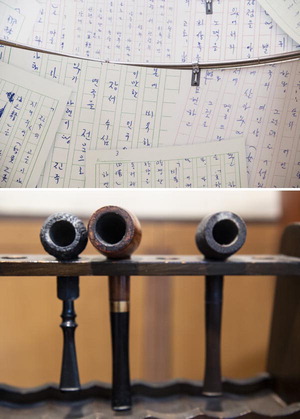 | À̺´ÁÖ¹®Çаü¿¡ Àü½ÃµÈ ÀÛ°¡ À̺´ÁÖÀÇ À°ÇÊ ¿ø°í(À§ÂÊ)¿Í ±×°¡ ¾²´ø ´ã¹è ÆÄÀÌÇÁ. |