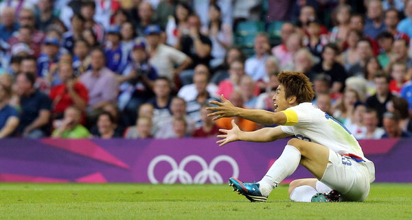 2012 ·±´ø¿Ã¸²ÇÈ Ã౸ ´ëÇ¥ÆÀ ÁÖÀå ±¸ÀÚö(¾Æ¿ìÅ©½ººÎ¸£Å©)ÀÌ Çѱ¹ÀÌ ¿Ã¸²ÇÈ Ã¹ ¸Þ´ÞÀ» µû´Â ½û±â°ñÀ» ³Ö°í ³ª¼ '¸¸¼¼ »ïâ' ¼¼¸®¸Ó´Ï¸¦ ÆîÃÄ ´«±æÀ» ²ø¾ú´Ù.