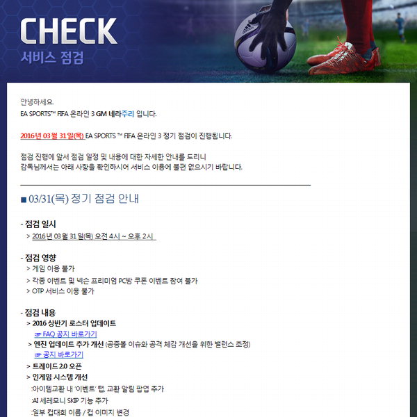 ¿Â¶óÀÎ Ã౸°ÔÀÓ ÇÇÆÄ¿Â¶óÀÎ3(FIFA¿Â¶óÀÎ3)°¡ Á¤±â Á¡°Ë°ú ÇÔ²² »ó¹Ý±â ·Î½ºÆ® ¾÷µ¥ÀÌÆ®¸¦ ½Ç½ÃÇÑ´Ù.