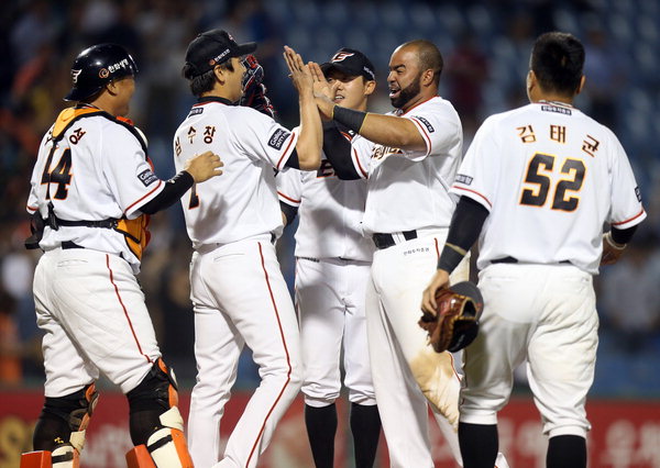 | Áö³ 7ÀÏ KIA¿ÍÀÇ °æ±â¿¡ ½Â¸®ÇÑ ÇÑÈ ¼±¼öµéÀÌ È¯È£Çϰí ÀÖ´Ù. ¿¬ÇÕ´º½º |