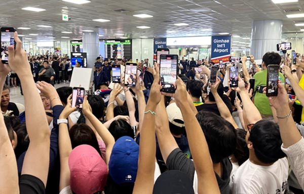 | À̰ÀÎÀ» ºñ·ÔÇÑ ÆÄ¸® »ýÁ¦¸£¸Í ¼±¼ö´ÜÀÌ 2ÀÏ ±èÇØ±¹Á¦°øÇ× ÀÔ±¹Àå¿¡ ¸ð½ÀÀ» ³ªÅ¸³»ÀÚ ÆÒµéÀÌ ÈÞ´ëÀüÈ·Î »çÁøÀ» Âï°í ÀÖ´Ù. ¿¬ÇÕ´º½º |