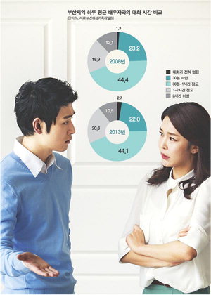 ºÎ»êÁö¿ª ºÎºÎÀÇ ÇÏ·ç Æò±Õ ´ëȽð£À» ¹¯´Â Áú¹®¿¡ '30ºÐ~1½Ã°£ Á¤µµ'(44.1%)¶ó´Â ÀÀ´äÀÌ °¡Àå ¸¹¾Ò´Ù. ÀÌ´Â 2008³âÀÇ ÀÀ´ä·ü(44.4%)¿¡ ºñÇØ ´Ù¼Ò ³·°í, Àü±¹ Æò±ÕÄ¡(40.0%)º¸´Ù ³ôÀº ¼öÁØÀÌ´Ù. ÇÏÁö¸¸ 1½Ã°£ ÀÌ»ó ±ä ´ëÈ´Â ºÎ»êÀÌ ´Ù¸¥ Áö¿ªº¸´Ù ª¾Ò´Ù. ºÎºÎ ´ëȽð£ÀÌ '1~2½Ã°£'À̶ó´Â ÀÀ´äÀÌ Àü±¹ Æò±ÕÀº 26.2%Àε¥ ºñÇØ ºÎ»êÀº 20.6%¿¡ ±×ÃÆ´Ù. '2½Ã°£ ÀÌ»ó'Àº Àü±¹ÀÌ 16.5%À̰í, ºÎ»êÀº 10.5%¿¡ ºÒ°úÇß´Ù.