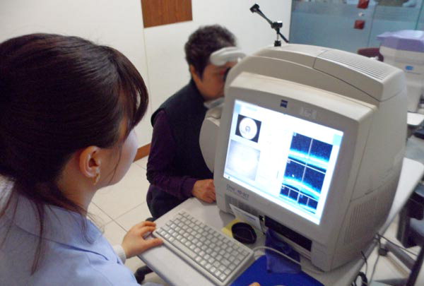 | ¼ºÀÎ ½Ç¸í(½Ã°¢Àå¾Ö)ÀÇ ¿øÀÎ ÁúȯÀΠȲ¹Ýº¯¼ºÀº µÎ ´«¿¡ µ¿½Ã ¹ß»ýÇϰí Á߽ɽ÷ÂÀ» ¼¼È÷ °¨Åð½ÃŲ´Ù. »çÁøÀº ¾È°úº´¿ø¿¡¼ ȯÀÚ°¡ ¸Á¸·Áúȯ ¿©ºÎ¸¦ °Ë»çÇÏ´Â Àå¸é. |