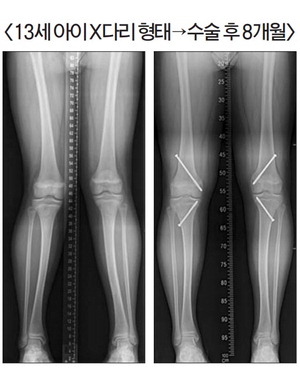 ¼ºÀÎÀÇ OÀÚ XÀÚ ´Ù¸® ¼ö¼úÀº Àý°ñ¼úÀ» ½ÃÇàÇÏÁö¸¸, ¾î¸°ÀÌ´Â ¹«¸°üÀýÀ» ÀÌ·ç´Â ´ëÅð°ñ°ú °æ°ñÀÇ ³»¡¤¿ÜÃø ¼ºÀåÆÇ Á¶Àý·Î ±³Á¤ÇÒ ¼ö ÀÖ´Ù. ±×°Í¿¡´Â ¿©·¯ ¹æ¹ýÀÌ Àִµ¥, ÃÖ±Ù¿¡´Â 1cm Á¤µµ ÀÛ°Ô Àý°³ÇÑ µÚ ³ª»ç¸øÀ¸·Î ¼ºÀåÆÇ ÀϺθ¦ ¾ïÁ¦ÇØ °¢±³Á¤À» ÇÑ ´ÙÀ½, °°Àº Àý°³·Î ³ª»ç¸øÀ» Á¦°ÅÇÏ´Â ¹æ½ÄÀÌ ¸¹ÀÌ ÀÌ·ïÁø´Ù. ÀÌ´Â ¼ö¼ú ÈÄ ¹Ù·Î ÀÏ»ó »ýȰÀÌ °¡´ÉÇϸç, ´ëü·Î 1³â ³» ±³Á¤ÀÌ ³¡³´Ù. ´Ù¸¸, ³ª»ç¸øÀ» Á¦°ÅÇÑ ÈÄ ³²Àº ¼ºÀåÆÇÀÇ ¿µÇâÀ¸·Î ÀÎÇØ º¯ÇüÀÌ Àç¹ßµÉ ¼ö ÀÖ´Ù. µû¶ó¼ ¼ºÀåÀÌ ¸¶¹«¸®µÆÀ» ¶§ ³ª»ç¸øÀ» Á¦°ÅÇÒ ¼ö ÀÖµµ·Ï ÀûÀýÇÑ ³ªÀÌ¿¡ ¼ö¼úÀ» ÇØ¾ß ÇÑ´Ù. º¸Åë ¼ºÀåÆÇÀÌ 1~2³â ³²¾ÒÀ» ¶§°¡ ÁÁ´Ù. ³²ÀÚ ¾ÆÀÌ´Â ÁßÇб³ 1Çгâ, ¿©ÀÚ ¾ÆÀÌ´Â Ãʰæ Á÷Èĸ¦ ±× ½Ã±â·Î º¼ ¼ö ÀÖ´Ù.