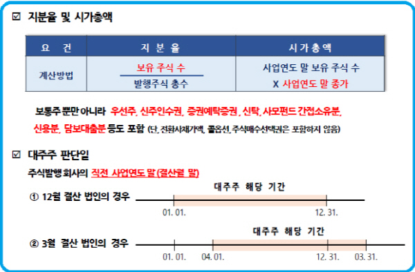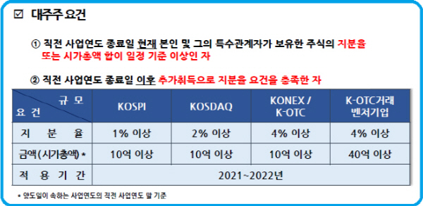 »óÀåÁֽĿ¡ ´ëÇÑ ¾çµµ¼¼ °ú¼¼´ë»óÀÌ µÇ´Â ´ëÁÖÁÖ¶õ ¿ì¼± Á÷Àü »ç¾÷¿¬µµ Á¾·áÀÏ ÇöÀç º»ÀÎ ¹× ±×ÀÇ Æ¯¼ö °ü°èÀÚ°¡ º¸À¯ÇÑ ÁÖ½ÄÀÇ ÁöºÐÀ²À̳ª ½Ã°¡ÃѾ×ÀÇ ÇÕÀÌ ÀÏÁ¤±âÁØ ÀÌ»óÀÎ ÀÚ¸¦ ¸»ÇÑ´Ù. ¶ÇÇÑ Á÷Àü »ç¾÷¿¬µµ Á¾·áÀÏ ÀÌÈÄ Á¾¸ñÀÇ Ãß°¡ÃëµæÀ¸·Î ÁöºÐÀ²¿ä°ÇÀ» ÃæÁ·ÇÑ ÀÚ°¡ ÇØ´çµÈ´Ù. ¿ÃÇØ¿Í ³»³âÀÎ 2022³âÀ» ±âÁØÀ¸·Î º¼ ¶§ KOSPI, KOSDAQ, K-OTC(KONEX)½ÃÀå¿¡¼ ±Ý¾×±âÁØÀÎ ½Ã°¡ÃÑ¾× ¿ä°ÇÀº ¸ðµÎ 10¾ï ÀÌ»óÀ», ÁöºÐÀ²·Î º¼ ¶§ Àû¿ë±âÁØÀº 1%, 2%, 4%ÀÌ»óÀÎ °æ¿ì´Ù.