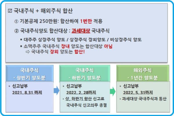 ´Ù¸¸ ±¹³»Áֽİú ÇØ¿ÜÁÖ½ÄÀÇ ½Å°í¿Í ³³ºÎ±âÇÑÀÌ ´Ù¸§¿¡ ÁÖÀÇÇÏÀÚ. ±¹³»ÁÖ½ÄÀÇ °æ¿ì ¾çµµ¼Òµæ¼¼´Â ¹Ý±â ÈÄ 2°³¿ù ¸»±îÁö ¿¹Á¤½Å°íÇÏ¸é µÈ´Ù. Áï 8¿ù 31ÀÏ ¶Ç´Â ´ÙÀ½ÇØ 2¿ù 28ÀϱîÁö´Ù. ¹Ý¸é ÇØ¿ÜÁÖ½ÄÀÇ °æ¿ì ¿¬ 1ȸ È®Á¤ ½Å°í ³³ºÎÇϱ⿡ ´ÙÀ½ÇØ 5¿ù 31ÀϱîÁö´Ù. µû¶ó¼ ´ÙÀ½ÇØ 5¿ù ¸»ÀϱîÁö ±¹³»Áֽİú ÇØ¿ÜÁÖ½ÄÀÇ ¾çµµ¼ÕÀÍÀ» ÇÕ»ê(Åë»ê)ÇØ¼ ½Å°í³³ºÎÇÏ¸é µÈ´Ù. ÇÊ¿ä°æºñ Áß Áõ±Ç°Å·¡¼¼´Â »óÀåÁÖ½ÄÀÇ °æ¿ì ¸Å¸Å ½Ã Áõ±Ç°Å·¡¼Ò¿¡¼ ¿øÃµÂ¡¼ö°¡ µÇÁö¸¸ »óÀåÁÖ½ÄÀÇ Àå¿Ü°Å·¡³ª ºñ»óÀå ÁÖ½ÄÀÇ °æ¿ì¿¡´Â Áõ±Ç°Å·¡¼¼¸¦ ½Å°í±âÇÑ(¹Ý±âÀÇ ¸»ÀϷκÎÅÍ 2°³¿ù)³» ½Å°í ¹× ³³ºÎÇØ¾ß µÊÀ» ±â¾ïÇÏÀÚ.