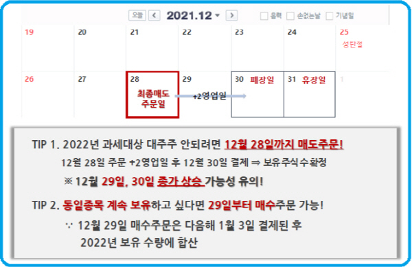 ³»³âÀÎ 2022³â °ú¼¼´ë»ó ´ëÁÖÁÖ°¡ µÇÁö ¾ÊÀ¸·Á¸é Àû¾îµµ 12¿ù 28ÀϱîÁö´Â ÁÖ½Ä ¸ÅµµÁÖ¹®À» ÇØ¾ß ÇÑ´Ù. 12¿ù 28ÀÏ ÁÖ¹®À» ³»¸é 2¿µ¾÷ÀÏ ÈÄÀÎ 30ÀÏ¿¡ °áÁ¦µÇ¾î º¸À¯ÁÖ½Ä ¼ö°¡ È®Á¤µÇ±â ¶§¹®ÀÌ´Ù. ´Ü ÁÖ½ÄÀ» ¸ÅµµÇÏ¿© ´ëÁÖÁÖ¿ä°ÇÀ» ÇÇÇß´õ¶óµµ ´ÙÀ½³¯ÀÎ 29Àϰú 30ÀÏ ÁÖ°¡ÀÇ »ó½Â°¡´É¼ºÀº ¿°µÎ ÇØ µÎ¾î¾ßÇÑ´Ù. Á¾°¡°¡ ±ÞµîÇÏ¿© ±Ý¾×±âÁØÀ¸·Î 10¾ïÀ» ÃʰúÇÒ ¼öµµ Àֱ⠶§¹®ÀÌ´Ù. Âü°í·Î 29ÀÏ ¸Å¼öÁÖ¹® ºÐÀº ´ÙÀ½ÇØ 1¿ù 3ÀÏ °áÁ¦µÇ±â¿¡ 2022³â º¸À¯¼ö·®¿¡ ÇÕ»êµÈ´Ù.