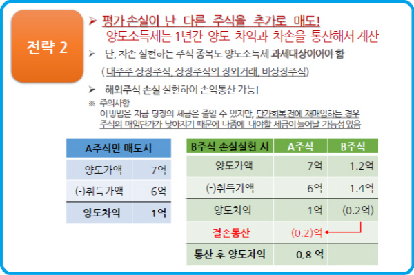 Æò°¡¼Õ½ÇÀÌ ³ ´Ù¸¥ ÁÖ½ÄÀ» Ãß°¡·Î ¸ÅµµÇÏ´Â ¹æ¹ýµµ ÀÖ´Ù. ¾çµµ¼Òµæ¼¼´Â 1³â°£ ¾çµµÂ÷ÀͰú Â÷¼ÕÀ» Åë»êÇÏ¿© °è»êÇÑ´Ù. AÁֽİú BÁÖ½ÄÀ» º¸À¯ ½Ã AÁֽĸ¸ ¸ÅµµÇÏ¸é ¾çµµÂ÷ÀÍÀÌ Å¬ ¼öµµ ÀÖÁö¸¸ Ãëµæ°¡¾× ´ëºñ ¼Õ½Ç ³ BÁÖ½ÄÀ» ¸ÅµµÇÏ¿© ¾çµµÂ÷¼ÕÀ» ¹ß»ý½ÃŲ´Ù¸é °á¼ÕÀÎ ºÎºÐÀ» Åë»êÇÏ¿© ¾çµµ¼¼ °ú¼¼Ç¥ÁØÀ» ³·Ãâ ¼ö ÀÖ´Â °ÍÀÌ´Ù. ´Ü Â÷¼ÕÀ» ½ÇÇöÇÏ´Â ÁÖ½ÄÁ¾¸ñµµ ¾çµµ¼Òµæ¼¼ °ú¼¼´ë»óÀ̾î¾ß ÇÑ´Ù. Áï ´ëÁÖÁÖ »óÀåÁÖ½Ä, »óÀåÁÖ½ÄÀÇ Àå¿Ü°Å·¡, ºñ»óÀå ÁÖ½ÄÀ̾î¾ß ÇÑ´Ù´Â °ÍÀÌ´Ù. ÇØ¿ÜÁÖ½Ä ¼Õ½ÇºÎºÐµµ ½ÇÇöÇÏ¿© ¼ÕÀÍÅë»êÀÌ °¡´ÉÇϱ⿡ Ȱ¿ëÇÒ¸¸ÇÏ´Ù.