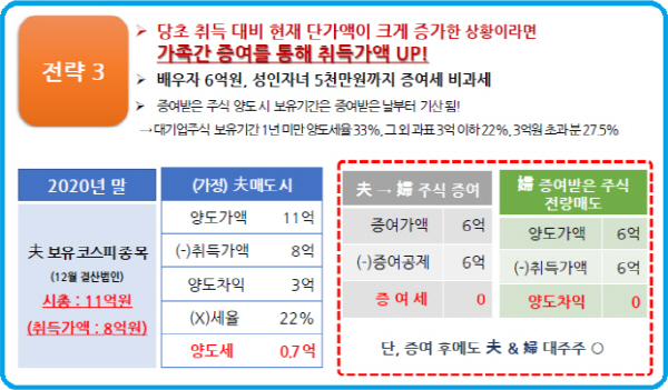 ¸¶Áö¸·À¸·Î ´çÃÊ Ãëµæ°¡°Ý ´ëºñ ÇöÀç ´Ü°¡°¡ Å©°Ô »ó½ÂÇÑ °æ¿ì¶ó¸é °¡Á· °£ Áõ¿©¸¦ ÅëÇØ Ãëµæ°¡¾×À» ³ôÀÌ´Â ¹æ¹ýµµ ÀÖ´Ù. Áõ¿©¼¼ ¸éÁ¦Çѵµ(ºñ°ú¼¼)°¡ 10³â°£ ¹è¿ìÀÚ°¡ 6¾ï ¿ø, ¼ºÀÎÀڳడ 5õ¸¸ ¿øÀÓÀ» Ȱ¿ëÇÏ´Â °ÍÀÌ´Ù. Áõ¿©¹ÞÀº ÁÖ½ÄÀ» ¾çµµ ½Ã¿¡´Â º¸À¯±â°£ °è»êÀÌ Áõ¿©¹ÞÀº ³¯ºÎÅÍ ±â»êµÈ´Ù. ´ë±â¾÷ÁÖ½ÄÀº º¸À¯±â°£ÀÌ 1³â ¹Ì¸¸ÀÎ °æ¿ì ¾çµµ ¼¼À² 33%, ±× ¿Ü´Â °ú¼¼Ç¥ÁØ 3¾ï ÀÌÇÏ´Â 22%, 3¾ï ÃʰúºÐÀº 27.5%´Ù. (Áö¹æ¼Òµæ¼¼ Æ÷ÇÔ)