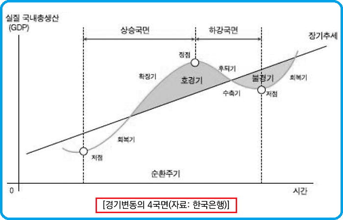 ÇÑ ³ª¶óÀÇ °æÁ¦°¡ ¼ºÀåÇÑ´Ù¸é ¡®GDPÁõ°¡¡¯·Î ³ªÅ¸³ª°í, ¿ì¸®´Â À̸¦ ¡®È®Àå±¹¸é¡¯ ¶Ç´Â ¡®°æ±âÀÇ È®Àå»çÀÌŬ¡¯À̶ó°í ºÎ¸¥´Ù. ¹Ý´ë·Î ¼ºÀåÀÌ ´õµð¾îÁú ¶§ ¡®°æ±âÀÇ ¼öÃà±¹¸é¡¯À̶ó°í Ç¥ÇöÇÏ°í ¸¶À̳ʽº(-)°¡ ¿¬¼ÓÀûÀ¸·Î ³ª¿À°Ô µÇ¸é ¡®ºÒȲ¡¯À̶ó°í ºÎ¸¥´Ù. ºÒȲ¿¡ ºüÁú ¶§ Á¤ºÎ´Â ÀçÁ¤À» ÅõÀÔÇϰųª Áß¾ÓÀºÇàÀÌ ÅëÈ­¿ÏÈ­ Á¤Ã¥À» Æì¸ç °æ±âºÎ¾çÀ» ÇÏ°Ô µÈ´Ù.