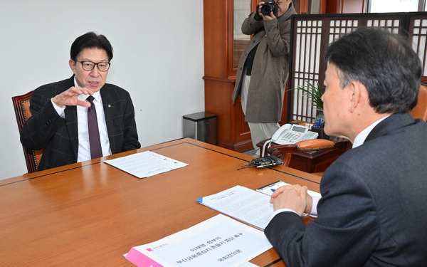 ¹ÚÇüÁØ ºÎ»ê½ÃÀåÀÌ 23ÀÏ ±ÝÀ¶Áß½ÉÁö ºÎ»ê »ç¼ö¿Í À§»ó °­È­¸¦ À§ÇÑ °ÇÀǹ®À» À±ÇÑÈ« ±¹¹ÎÀÇÈû Á¤¹«À§¿øÀå¿¡°Ô Àü´ÞÇÑ ÈÄ ÀǰßÀ» ¹àÈ÷°í ÀÖ´Ù. ±èÁ¤·Ï ±âÀÚ