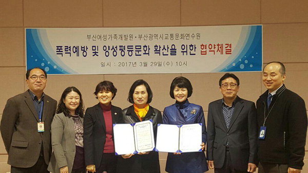 ºÎ»ê¿©¼º°¡Á·°³¹ß¿ø(¿øÀå ±è¸§ÀÌ)°ú ºÎ»ê±¤¿ª½Ã±³Å빮ȿ¬¼ö¿ø(¿øÀå Á¤Ã¤¼÷)Àº Áö³´Þ 29ÀÏ Æø·Â¿¹¹æ ¹× ¾ç¼ºÆòµî¹®È È®»êÀ» À§ÇÑ ¾÷¹« Çù¾à½Ä(»çÁø)À» ¿¾ú´Ù. °³¹ß¿øÀº ¿©¼º°¡Á·ºÎ¿Í ºÎ»ê½ÃÀÇ À§Å¹À» ¹Þ¾Æ '2017³âµµ ã¾Æ°¡´Â Æø·Â¿¹¹æ±³À° »ç¾÷ Áö¿ª°ÅÁ¡±â°ü'À¸·Î¼ ã¾Æ°¡´Â Æø·Â¿¹¹æ±³À°À» Áö¿øÇϰí ÀÖ´Ù. ÀÌÀºÁ¤ ±âÀÚ