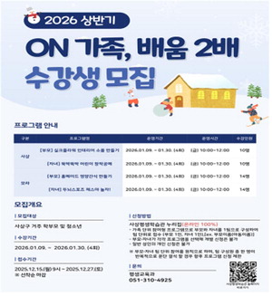 ºÎ»ê »ç»ó±¸(±¸Ã»Àå Á¶º´±æ)´Â °¡Á· Á᫐ Æò»ýÇнÀ Ȱ¼ºÈ¸¦ À§ÇØ ³»³âºÎÅÍ »õ·Î¿î °¡Á·Âü¿©Çü ÇÁ·Î±×·¥ÀÎ ¡®ON °¡Á·, ¹è¿ò 2¹è¡¯(Æ÷½ºÅÍ)¸¦ ¿î¿µÇÑ´Ù°í 9ÀÏ ¹àÇû´Ù. À̹ø ÇÁ·Î±×·¥Àº ºÎ¸ð¿Í Àڳడ ÇÑ ÆÀÀ» ÀÌ·ï ÇнÀ¿¡ Âü¿©ÇÏ´Â ¹æ½ÄÀ¸·Î ±âȹµÅ °¡Á· °£ ¼ÒÅë°ú ¼ºÀåÀÇ ÀåÀÌ µÉ °ÍÀ¸·Î º¸ÀδÙ.