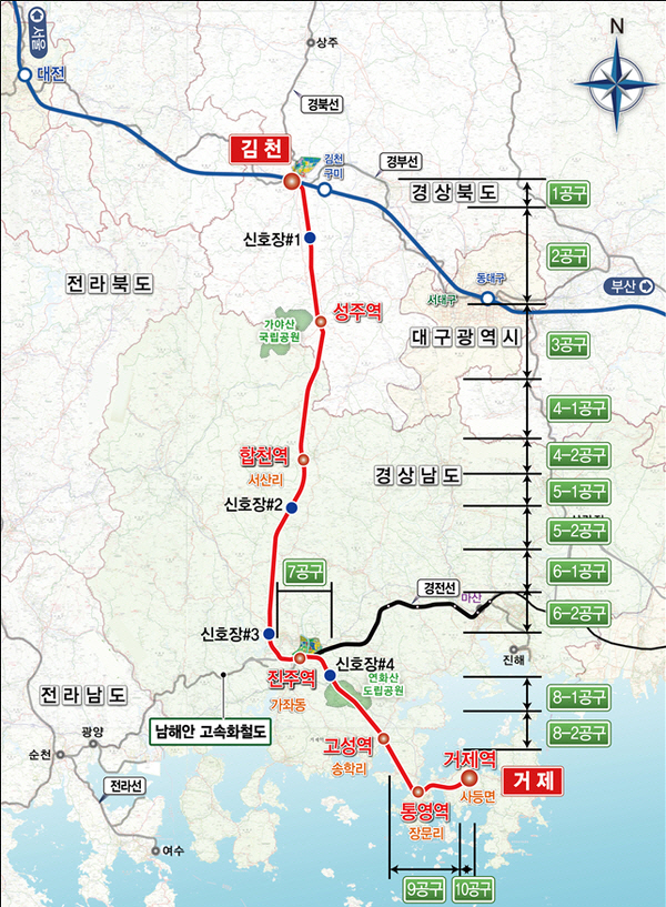¾ÕÀ¸·Î °Ç¼³»çµéÀº ÀÌ °èȹ¿¡ µû¶ó 2031³â 12¿ù 31ÀϱîÁö °æºÏ ±èõ°ú °æ³² °ÅÁ¦¸¦ ÀÕ´Â °í¼Óöµµ¸¦ ¸¸µç´Ù. ÃÑ»ç¾÷ºñ´Â 6Á¶7000¾ï ¿øÀ¸·Î Ã¥Á¤µÆ´Ù. Àüü ±æÀÌ´Â 177.9§°´Ù. ±³·®Àº 58°³, ÅͳÎÀº 43°³°¡ µé¾î¼±´Ù. Á¤°ÅÀåÀº 6°÷ÀÌ´Ù. ±èõ¿ª°ú ÁøÁÖ¿ªÀº ±âÁ¸ ¿ª»ç¸¦ ±×´ë·Î ÀÌ¿ëÇÑ´Ù. °æºÏ ¼ºÁÖ¿Í °æ³² ÇÕõ, °í¼º, Å뿵¿¡´Â ¿ª»ç¸¦ »õ·Î Áþ´Â´Ù. °ÅÁ¦¿ª ½Å¼³Àº 10°ø±¸ ½Ç½Ã°èȹ ½ÂÀÎ ¶§ È®Á¤µÉ ¿¹Á¤ÀÌ´Ù. Á¤ºÎ´Â ¿ÃÇØ ³²ºÎ³»·úöµµ °Ç¼³ »ç¾÷¿¡ ±¹ºñ 2609¾ï ¿øÀ» ¹Ý¿µÇß´Ù.