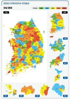ºÐ¾ßº°·Î ¾ÈÀüÁö¼ö 1µî±ÞÀ» ¹ÞÀº ½Ãµµ´Â ¡®±³Åë»ç°í¡¯ ¼¿ï¡¤°æ±â, ¡®ÈÀ硯 ¿ï»ê¡¤°æ±â, ¡®¹üÁË¡¯ ¼¼Á¾¡¤Àü³², ¡®»ýȰ¾ÈÀü¡¯ ºÎ»ê¡¤°æ±â, ¡®ÀÚ»ì ¹× °¨¿°º´¡¯ ¼¼Á¾¡¤°æ±â´Ù.