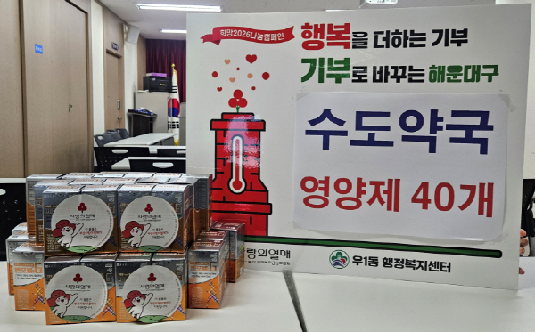 ÇØ¿î´ë±¸ ¿ì1µ¿¿¡ ¼ÒÀçÇÑ ¼öµµ¾à±¹(´ëÇ¥ ÀÌ¿µÀç)Àº Áö³ 15ÀÏ, ¿µ¾çÁ¦ 40°³(100¸¸¿ø »ó´ç)À» ¿ì1µ¿ ÇàÁ¤º¹Áö¼¾ÅÍ(µ¿Àå Á¤Çö¼÷)¿¡ Àü´ÞÇß´Ù.