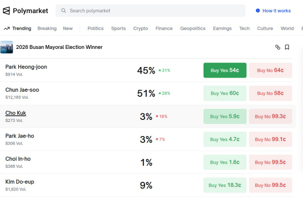 ¹Ì±¹ÀÇ ºí·ÏüÀÎ ±â¹Ý ¿¹Ãø½ÃÀå ¡®Æú¸®¸¶ÄÏ(Polymarket)¡¯¿¡¼­ ´õºÒ¾î¹ÎÁÖ´ç ÀüÀç¼ö(ºÎ»ê ºÏ°©) ÀÇ¿øÀÌ 6¡¤3ÀÏ Áö¹æ¼±°Å¿¡¼­ ºÎ»ê½ÃÀå ¼±°Å ´ç¼± È®·ü 1À§¸¦ ±â·Ï ÁßÀÌ´Ù.