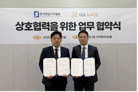 ±èÇüÁø Çѱ¹ÆíÁý±âÀÚÇùȸÀå(¿ÞÂÊ)°ú ±è°æÈ£ ´ë±³ ´ºÀÌÇÁ ´ëÇ¥À̻簡 Áö³­ 26ÀÏ ¼­¿ï ´ë±³Å¸¿ö¿¡¼­ ¡®»óÁ¶ ¼­ºñ½º¿Í °øµ¿ ±âȹ »ç¾÷¡®¿¡ °üÇØ ¾÷¹«Çù¾àÀ» ü°áÇϰí ÀÖ´Ù.
