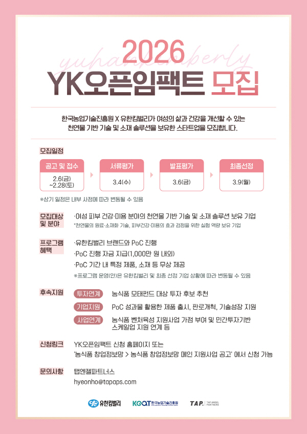 ÀÌ¿Í º°°³·Î Çѱ¹³ó¾÷±â¼úÁøÈï¿øÀº 27ÀϱîÁö À¯ÇÑÅ´¹ú¸®¿Í °øµ¿À¸·Î ÃßÁø ÁßÀÎ ¡®YK¿ÀÇÂÀÓÆÑÆ®(YK Open Impact)¡¯ ÇÁ·Î±×·¥ÀÇ Âü¿© ±â¾÷À» ã´Â´Ù. ³ó½Äǰ ºÐ¾ßÀÇ À¯¸Á ±â¾÷À» ¹ß±¼, Çõ½Å ±â¼ú°ú Á¦Ç°ÀÌ ½ÇÁ¦ ½ÃÀå¿¡¼­ ±¸ÇöµÉ ¼ö ÀÖµµ·Ï µ½ÀÚ´Â ÃëÁö´Ù. »ê¾÷ ÇöÀå¿¡¼­ Áï½Ã Ȱ¿ë °¡´ÉÇÑ ±â¼úÀ» º¸À¯ÇÑ ±â¾÷À̶ó¸é ½ÃÀå ÁøÀÔ°ú ¼ºÀåÀ» °¡¼ÓÇÒ ±âȸ¸¦ ¾ò°Ô µÈ´Ù. ½ÅûÀº ¿Â¶óÀÎÀ¸·Î¸¸ ÇÒ ¼ö ÀÖ´Ù.