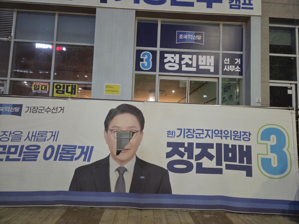 Á¶±¹Çõ½Å´ç ºÎ»ê½Ã´çÀº Áö³ 22ÀÏ ¼±°Å »ç¹«½Ç ¾Õ¿¡ °É¾îµÐ Á¤Áø¹é Èĺ¸ÀÇ Çö¼ö¸·ÀÌ ÈÑ¼ÕµÈ °ÍÀ» ¹ß°ßÇÏ°í °æÂû¿¡ ¼ö»ç¸¦ ÀÇ·ÚÇß´Ù°í 24ÀÏ ¹àÇû´Ù. Á¤ Èĺ¸ ¼±°Å»ç¹«¼Ò °ü°èÀÚ´Â ¡°ÀÌ¹Ì 10ÀÏ Àü Çö¼ö¸·ÀÇ »çÁø ¿À¸¥ÂÊ ´«µ¿ÀÚ¿¡ ´ã¹îºÒ·Î ±³¹¦ÇÏ°Ô ±¸¸ÛÀ» ³½ °ÍÀ» ¹ß°ßÇØ °æÂû¿¡ ¼ö»ç ÀÇ·ÚÇÑ »óÅ¿´´Ù. ±×·±µ¥ 23ÀÏ ¹ã Á¤ Èĺ¸ ¾ó±¼ ºÎºÐÀ» Ä®·Î ÈäÃøÇÏ°Ô ¿À·Á³½ °ÍÀ» ¹ß°ßÇØ °æÂû¿¡ ´Ù½Ã ½Å°íÇß´Ù¡±¸ç ¡°µ¿ÀϹü ¼ÒÇàÀÏ °¡´É¼ºÀÌ ÀÖ°í, »çÁø ¼Ó Èĺ¸ ¾ó±¼À» ÁýÁßÀûÀ¸·Î ÈѼÕÇÑ °ÍÀ¸·Î º¸¾Æ °íÀǼºÀÌ ÀÖ´Ù°í º»´Ù¡±¸ç öÀúÇÑ °ø°³ ¼ö»ç¸¦ ¿äûÇß´Ù.