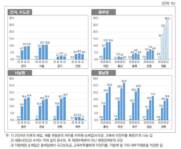 ½ÇÁ¦ ÁöÀÚüº° ¼¼ÀÔ Àü¸ÁÀ» º¸¸é ¼¼Á¾ °æ±â ÀÎõ Á¦ÁÖ Ãæ³² ÃæºÏ µîÀÌ ¼¼ÀÔ Áõ°¡¸¦ ÁÖµµÇß´Ù. ±×¿Ü Áö¿ªÀº ¼¼ÀÔ Á¤Ã¼ ȤÀº °¨¼Ò·Î Àü¸ÁµÆ´Âµ¥, º¸°í¼­´Â ¡°¼öµµ±Ç°ú ÁߺαÇÀº Àα¸ ±Ô¸ð À¯Áö¿Í °æÁ¦È°µ¿ ±â¹Ý ÁýÁßÀ¸·Î ¼¼ÀÔ ±â¹ÝÀÌ È®ÀåµÇ´Â ¹Ý¸é, µ¿³²±Ç°ú ¼­³²±ÇÀº »ý»ê¿¬·ÉÀα¸ °¨¼Ò¿Í »ê¾÷±â¹Ý ¾àÈ­·Î ¼¼ÀÔ Áõ°¡°¡ Á¦Çѵȴ١±°í ¼³¸íÇß´Ù. º¸°í¼­´Â ƯÈ÷ µ¿³²±ÇÀÇ °æ¿ì 2035³âÀÌ µÇ¸é ¸ðµç ±¤¿ª½Ãµµ¿¡¼­ ¼ø¼¼ÀÔ Ç϶ôÀÌ ½ÃÀÛµÉ °ÍÀ¸·Î Àü¸ÁÇß´Ù.