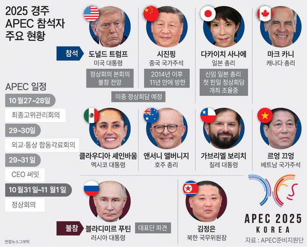 ¿À´Â 27ÀÏ ½ÃÀÛÇÏ´Â °æÁÖ APEC(¾Æ½Ã¾ÆÅÂÆò¾ç°æÁ¦Çù·Âü) Á¤»óȸÀÇ ÁÖ°£¿¡´Â ¹Ì±¹°ú Áß±¹À» Æ÷ÇÔÇÑ ¾Æ½Ã¾Æ ÅÂÆò¾ç Áö¿ª 21°³ ±¹°¡ Á¤»óµéÀÌ Âü¼®, APEC ½´ÆÛÀ§Å©°¡ ÁøÇàµÉ Àü¸ÁÀÌ´Ù.