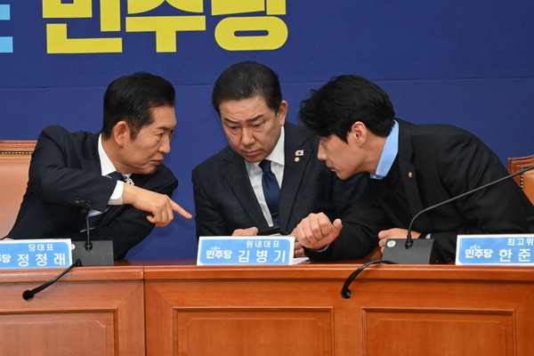 ´õºÒ¾î¹ÎÁÖ´ç Á¤Ã»·¡(¿ÞÂʺÎÅÍ) ´ëÇ¥, ±èº´±â ¿ø³»´ëÇ¥, ÇÑÁØÈ£ ÃÖ°íÀ§¿øÀÌ 26ÀÏ ±¹È¸¿¡¼­ ¿­¸° ÃÖ°íÀ§¿øÈ¸ÀÇ µµÁß ´Ù¼Ò ½É°¢ÇÑ Ç¥Á¤À¸·Î ´ëÈ­Çϰí ÀÖ´Ù. ±èÁ¤·Ï ±âÀÚ ilro12@kookje.co.kr