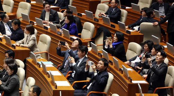 ´õºÒ¾î¹ÎÁÖ´ç ÀÇ¿øµéÀÌ 24ÀÏ ±¹È¸ º»È¸ÀÇÀå¿¡¼­ ¡®Á¤º¸Åë½Å¸Á ÀÌ¿ëÃËÁø ¹× Á¤º¸º¸È£ µî¿¡ °üÇÑ ¹ý·ü ÀϺΰ³Á¤¹ý·ü¾È(´ë¾È) ¼öÁ¤¾È¡¯ÀÌ °¡°áµÇ´Â ¼ø°£À» ÈÞ´ëÀüÈ­·Î ÃÔ¿µÇϰí ÀÖ´Ù. ¿¬ÇÕ´º½º