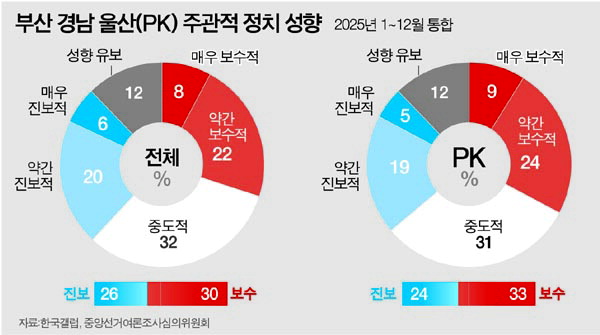 12ÀÏ ±¹Á¦½Å¹®ÀÌ ¿©·ÐÁ¶»ç Àü¹®±â°üÀÎ Çѱ¹°¶·´ÀÇ Áö³ÇØ 1~12¿ù Á¶»ç¸¦ ºÐ¼®ÇÑ °á°ú, PK¿¡¼ ÀÚ½ÅÀ» º¸¼ö¶ó°í ÀÀ´äÇÑ »ç¶÷Àº 33%¿´´Ù. Áøº¸¶ó´Â ÀÀ´äÀÚ´Â 24%¿¡ ºÒ°úÇß´Ù. ÁßµµÃþÀº 31%¿´°í, Á¤Ä¡Àû ¼ºÇâ À¯º¸ÃþÀº 12%¿´´Ù. PKÀÇ Á¤Ä¡Àû ¼ºÇâÀº Àüü(º¸¼öÃþ 30%, Áøº¸Ãþ 26%)¿¡ ºñÇØ º¸¼öÃþÀº Á¶±Ý ³ô°í, Áøº¸ÃþÀº ³·¾Ò´Ù. ÀÌ´Â ¿ª´ë PK ¼±°Å °á°ú¸¦ °¨¾ÈÇÏ¸é ³³µæµÇ´Â ¼öÁØÀÌ´Ù. ÀÌ °á°ú´Â Çѱ¹°¶·´ÀÇ Áö³ÇØ 1~12¿ù Á¶»ç¸¦ Á¾ÇÕÇÑ °á°ú´Ù.