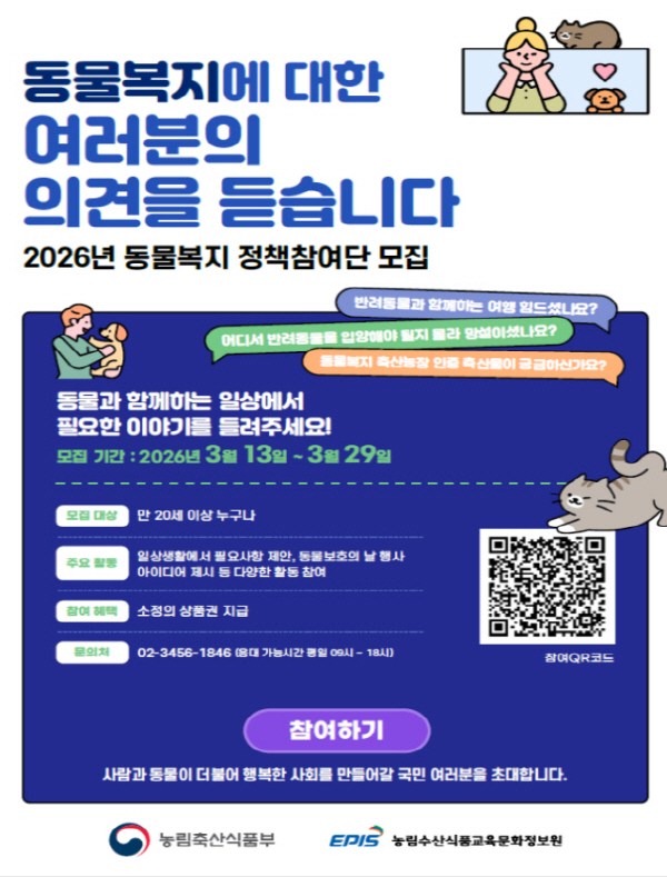 12ÀÏ ³ó¸²Ãà»ê½ÄǰºÎ´Â ¡®µ¿¹°º¹Áö Á¤Ã¥ Âü¿©´Ü¡¯À» ¸ðÁýÇÑ´Ù°í ¹àÇû´Ù. 20¼¼ ÀÌ»ó ±¹¹ÎÀÌ¸é ´©±¸³ª ½ÅûÇÒ ¼ö ÀÖ´Ù. Áö¿ø¼­ Á¦Ã⠱ⰣÀº 13ÀϺÎÅÍ 29ÀϱîÁö´Ù. ÀÚ¼¼ÇÑ »çÇ×Àº µ¿¹°»ç¶û¹è¿òÅÍ ´©¸®Áý(https://apms.epis.or.kr)¿¡¼­ È®ÀÎÇÏ¸é µÈ´Ù. ¼±Á¤µÈ À̵éÀº Æò¼Ò ¹Ý·Áµ¿¹°À» Ű¿ì¸é¼­ °ÞÀº ºÒÆíÇÑ Á¡À̳ª °³¼±µÆÀ¸¸é ÇÏ´Â »çÇ×, ºñ¹Ý·ÁÀÎ °üÁ¡¿¡¼­ ¹Ù¶óº» µ¿¹°º¹Áö Á¤Ã¥¿¡ ´ëÇÑ »ý°¢µéÀ» ÀÚÀ¯·Ó°Ô ¹àÈú ¼ö ÀÖ´Ù.