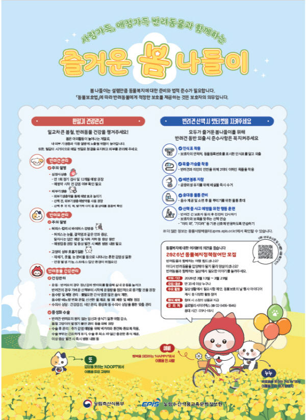 ÇÑÆí ³ó½ÄǰºÎ´Â º½Ã¶À» ¸Â¾Æ °³ µî°ú ÇÔ²² ¿ÜÃâÇÏ´Â »ç¶÷µéÀÌ ´Ã¾î³ªÀÚ ¹Ý·Áµ¿¹° °Ç°­ °ü¸® ¿ä·É°ú »êÃ¥ ¶§ ÁöÄÑ¾ß ÇÒ ¡®ÆêƼÄÏ¡¯µµ ÇÔ²² ¾È³»Çß´Ù. ±â¿ÂÀÌ ¿Ã¶ó°¡¸é¼­ º­·è¡¤Áøµå±â µî ¿ÜºÎ±â»ýÃæ Ȱµ¿ÀÌ È°¹ßÇØÁö±â ¶§¹®ÀÌ´Ù. ƯÈ÷ º½Ã¶¿¡´Â µ¿¹°µéÀÌ Ç®½£À̳ª Àܵð µî¿¡ Á¢ÃËÇÏ´Â ½Ã°£ÀÌ ¸¹¾Æ ±â»ýÃæ¿¡ ³ëÃâµÉ °¡´É¼ºÀÌ Ä¿Áø´Ù.