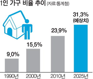 Åë°èûÀÌ 30ÀÏ ³»³õÀº 'Çѱ¹ÀÇ »çȸµ¿Çâ 2012'¸¦ º¸¸é ¿ì¸®³ª¶óÀÇ 1ÀÎ °¡±¸ ºñÀ²Àº 1990³â 9.0%¿¡¼ 2000³â 15.5%, 2010³â 23.9%·Î Áö³ 20³â°£ 2.6¹è ÀÌ»ó ´Ã¾ú´Ù. ÀÌ °°Àº Ãß¼¼¶ó¸é 13³â µÚÀÎ 2025³â 31.3%±îÁö Áõ°¡ÇÒ °ÍÀ¸·Î ¿¹ÃøµÆ´Ù. 3°¡±¸ Áß 1°÷Àº '³ªÈ¦·Î °¡±¸'ÀÎ ¼ÀÀÌ´Ù. ¹Ý¸é ÀüÅëÀû °¡Á· ÇüÅÂÀÎ 4ÀÎ °¡±¸ ºñÀ²Àº 1990³â 29.5%¿¡¼ 2010³â 22.5%·Î ÇÏÇâ °î¼±À» ±×·È´Ù.