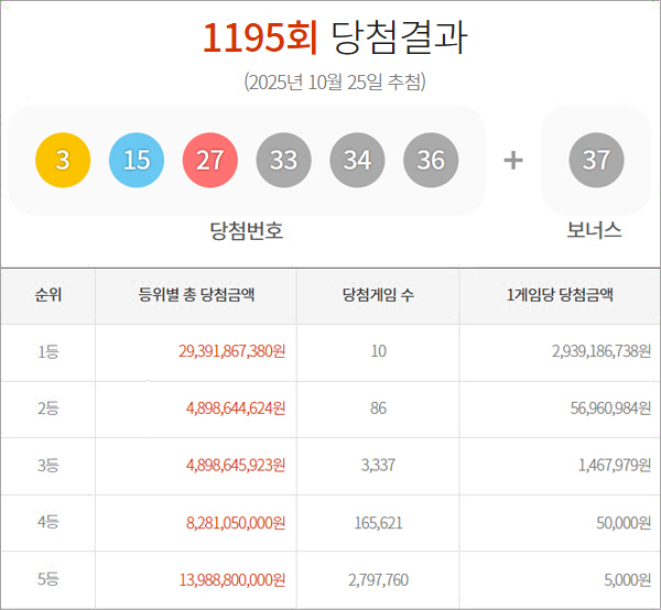 Á¦1195ȸ ·Î¶Çº¹±Ç Ãß÷¿¡¼ ¡®3, 15, 27, 33, 34, 36¡¯ÀÌ 1µî ¹øÈ£·Î »ÌÇû´Ù. 2µî º¸³Ê½º ¹øÈ£´Â ¡®37¡¯ÀÌ´Ù.