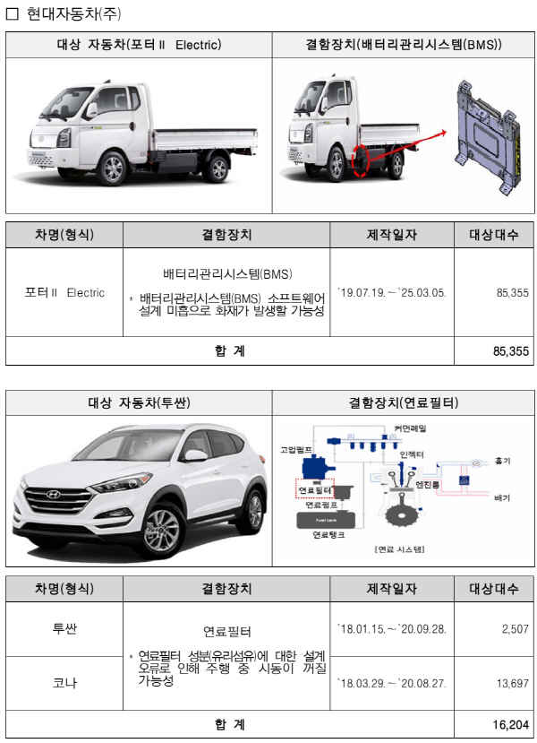 30ÀÏ ±¹Åä±³ÅëºÎ´Â Çö´ëÀÚµ¿Â÷¢ß, ±â¾Æ¢ß, BMWÄÚ¸®¾Æ¢ß, ½ºÅÚ¶õƼ½ºÄÚ¸®¾Æ¢ß¿¡¼ Á¦ÀÛ¡¤¼öÀÔ¡¤ÆÇ¸ÅÇÑ 57°³ Â÷Á¾ 26¸¸184´ë¿¡¼ Á¦ÀÛ °áÇÔÀÌ È®ÀÎµÆ´Ù°í ¹àÇû´Ù. Çö´ëÀÚµ¿Â÷ÀÇ Æ÷ÅÍ2 ÀÏ·ºÆ®¸¯ 8¸¸5355´ë¿Í ±â¾ÆÀÇ ºÀ°í3 EV 5¸¸4532´ë´Â ¹èÅ͸® °ü¸® ½Ã½ºÅÛ(BMS) ºÎǰ ¼³°è ¹ÌÈíÀ¸·Î ÈÀç°¡ ¹ß»ýÇÒ °¡´É¼ºÀÌ ÄÇ´Ù. Çö´ëÀÚµ¿Â÷ÀÇ Åõ½Ñ µî 2°³ Â÷Á¾ 1¸¸6204´ë¿Í ±â¾ÆÀÇ ¼¿Å佺 µî 2°³ Â÷Á¾ 2¸¸9680´ë´Â ¿¬·áÇÊÅÍ ¼ººÐ¿¡ ´ëÇÑ ¼³°è ¿À·ù·Î ÀÎÇØ ½Ãµ¿ÀÌ ²¨Áú ¼ö ÀÖ´Ù´Â Á¡ÀÌ ÁöÀûµÆ´Ù.