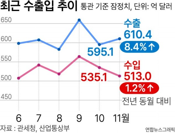 »ê¾÷Åë»óºÎ°¡ 1ÀÏ ¹ßÇ¥ÇÑ ¡®2025³â 11¿ù ¼öÃâÀÔ µ¿Ç⡯ ÀڷḦ º¸¸é Áö³´Þ ±¹³» Àüü ¼öÃâ¾×Àº 1³â Àü °°Àº ´Þº¸´Ù 8.4% Áõ°¡ÇÑ 610¾ï4000¸¸ ´Þ·¯¸¦ ±â·ÏÇß´Ù.