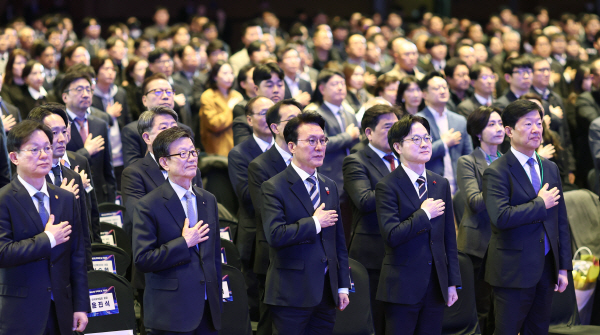 4ÀÏ ¼­¿ï ÄÚ¿¢½º¿¡¼­ ¿­¸° Á¦62ȸ ¹«¿ªÀÇ ³¯ ±â³ä½Ä¿¡¼­ ±è¹Î¼® ±¹¹«ÃѸ®(°¡¿îµ¥)¸¦ ºñ·ÔÇÑ Âü¼®ÀÚµéÀÌ ±¹±â¿¡ °æ·Ê¸¦ Çϰí ÀÖ´Ù. ¿¬ÇÕ´º½º