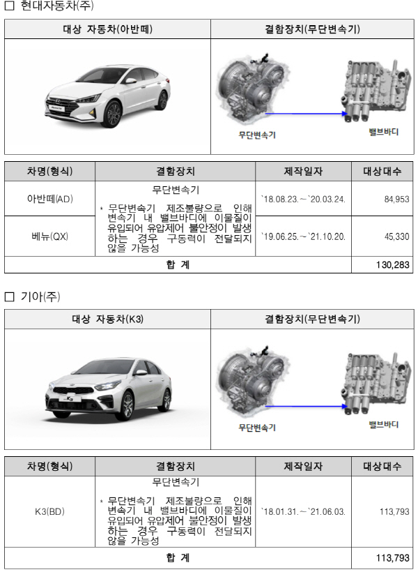 Çö´ëÀÚµ¿Â÷ÀÇ ¾Æ¹Ý¶¼ µî 2°³ Â÷Á¾ 13¸¸283´ë¿¡¼´Â ¹«´Üº¯¼Ó±â ºÎǰ ³»ºÎ·Î À̹°ÁúÀÌ À¯ÀԵб¸µ¿·ÂÀÌ Àü´ÞµÇÁö ¾ÊÀ» °¡´É¼ºÀÌ Å©´Ù´Â Á¡ÀÌ ÁöÀûµÆ´Ù. 11¸¸3793´ëÀÇ ±â¾Æ K3µµ °°Àº ÀÌÀ¯·Î ½ÃÁ¤Á¶Ä¡ ´ë»óÀÌ µÆ´Ù. ½ºÆ÷ƼÁö µî 2°³ Â÷Á¾ 3895´ë´Â ¹Ùµð Á¦¾îÀåÄ¡ ºÎǰ ¼³°è ¿À·ù ¶§¹®¿¡ ÁÖÂ÷°Å¸® °æ°í ±â´ÉÀÌ ÀÛµ¿ÇÏÁö ¾Ê¾Ò´Ù. ÀÌ´Â ¾ÈÀü±âÁØ ºÎÀûÇÕ »çÇ׿¡ ÇØ´çÇÑ´Ù.