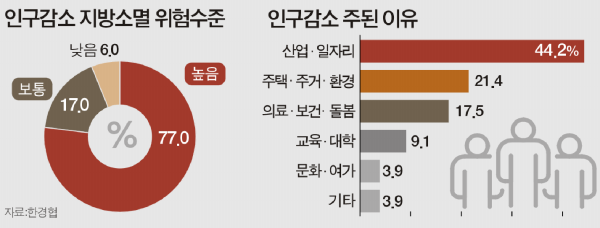 Àα¸°¨¼Ò¡¤Áö¹æ¼Ò¸ê À§Çè ¼öÁØÀÌ ¡®³ô´Ù¡¯°í ÀÀ´äÇÑ 77°³ ÁöÀÚü´Â °¡Àå Å« ¿øÀÎÀ¸·Î »ê¾÷¡¤ÀÏÀÚ¸® ºÎÁ·(44.2%)À» ²Å¾Ò´Ù. À̾î ÁÖÅá¤ÁÖ°Åȯ°æ(21.4%), ÀǷᡤº¸°Ç¡¤µ¹º½(17.5%), ±³À°¡¤´ëÇÐ(9.1%), ¹®È¡¤¿©°¡(3.9%) µîÀÇ ¼øÀ̾ú´Ù.