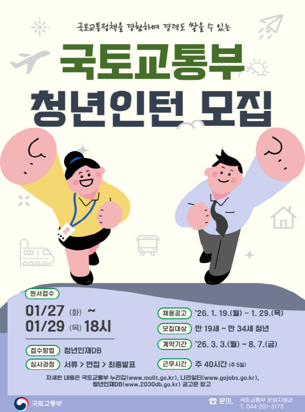 19ÀÏ ±¹Åä±³ÅëºÎ´Â ¡®2026 »ó¹Ý±â û³â ÀÎÅÏ¡¯À» ¼±¹ßÇÑ´Ù°í ¹àÇû´Ù. ¸ðÁý ÀοøÀº 160¸íÀÌ´Ù. ºÐ¾ß´Â ÇàÁ¤, È«º¸, ¿Ü±¹¾î, ½Ã¼³, Ç×°ø°üÁ¦, Ç×°ø Á¶Á¾, Àü»ê, °ø°£Á¤º¸, ±â·Ï °ü¸®, Çп¹, ½ÄǰÀ§»ý, Á¶¸® µî 12°³´Ù. 19~34¼¼ÀÇ Ã»³âÀ̶ó¸é Áö¿øÀÌ °¡´ÉÇÏ´Ù. ¸ðÁý ºÐ¾ßº° ¾÷¹«, ¿ì´ë ¿ä°Ç, ±Ù¹« ±â°ü(Áö¿ª), ÀÀ½Ã ¿ø¼­ Á¦Ãâ ¹æ¹ý µîÀº ±¹ÅäºÎ ´©¸®Áý(www.molit.go.kr), ³ª¶óÀÏÅÍ(www.gojobs.go.kr), û³âÀÎÀçDB(www.2030db.go.kr)¿¡¼­ È®ÀÎÇÏ¸é µÈ´Ù. Áö¿ø¼­´Â 29ÀϱîÁö ¹Þ´Â´Ù.