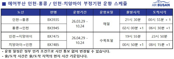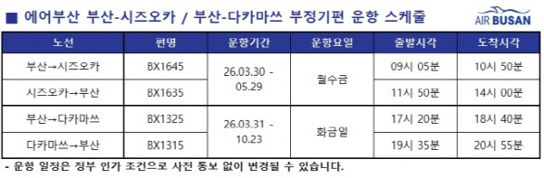 ºÎ»ê¹ß ½ÃÁî¿ÀÄ« ³ë¼±Àº ¿À´Â 3¿ù 30ÀϺÎÅÍ, ´ÙÄ«¸¶¾²´Â 31ÀϺÎÅÍ ÁÖ 3ȸ ÀÏÁ¤À¸·Î °¢°¢ ¿îÇ×À» ½ÃÀÛÇÑ´Ù. ÀÎõ¹ß È«Äá ³ë¼±Àº 3¿ù 29ÀϺÎÅÍ ÁÖ 7ȸ, Ä¡¾Ó¸¶ÀÌ´Â 4¿ù 29ÀϺÎÅÍ ÁÖ 4ȸ ÀÏÁ¤À¸·Î ¿îÇ×ÇÒ ¿¹Á¤ÀÌ´Ù.