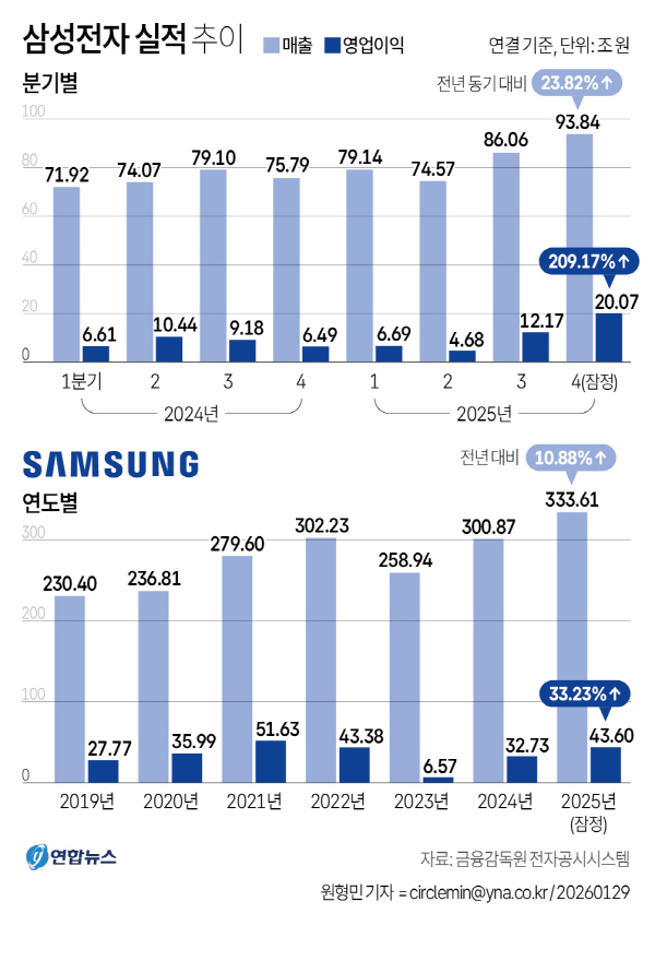 »ï¼ºÀüÀÚ´Â ¿¬°á ±âÁØÀ¸·Î Áö³­ÇØ ¿¬°£ ¿µ¾÷ÀÌÀÍÀÌ 43Á¶6011¾ï ¿øÀ¸·Î Àü³âº¸´Ù 33.2% Áõ°¡(ÀáÁ¤)Çß´Ù°í 29ÀÏ °ø½ÃÇß´Ù. Áö³­ÇØ ¿¬°£ ¸ÅÃâÀº 333Á¶6059¾ï ¿øÀ¸·Î Àü³â ´ëºñ 10.9% Áõ°¡Çß´Ù. ¼øÀÌÀÍÀº 45Á¶2068¾ï ¿øÀ¸·Î 31.2% ´Ã¾ú´Ù. ¿¬°£ ¸ÅÃâÀº ¿ª´ë ÃÖ´ë ±â·ÏÀÌ´Ù. ¿µ¾÷ÀÌÀÍÀº 2018³â(58Á¶80900¾ï ¿ø), 2017³â(53Á¶6500¾ï ¿ø), 2021³â(51Á¶6300¾ï ¿ø) ÀÌÈÄ ¿ª´ë ³× ¹øÂ°´Ù.
