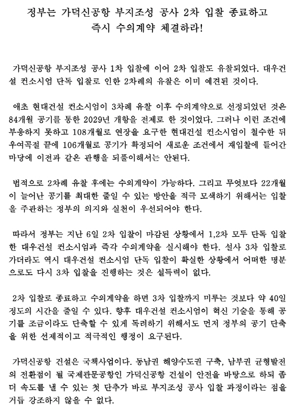 °¡´öµµ½Å°øÇ× ºÎÁö Á¶¼º °ø»ç¸¦ ¸ÃÀ» »ç¾÷ÀÚ ¼±Á¤ÀÌ ´Ù½Ã ½ÇÆÐ·Î ³¡³µ´Ù. Áö¿ª»çȸ¿¡¼´Â 2035³â ¸» °³Ç×ÀÌ µÇ·Á¸é ½Å¼ÓÇÑ ÈÄ¼Ó ÀýÂ÷ ÀÌÇàÀÌ ÇÊ¿äÇÏ´Ù¸ç Á¤ºÎ°¡ Àç°ø°í ´ë½Å Áï½Ã ¼öÀǰè¾àÀ» ¼±ÅÃÇØ¾ß ÇÑ´Ù°í ¸ñ¼Ò¸®¸¦ ³ôÀδÙ.