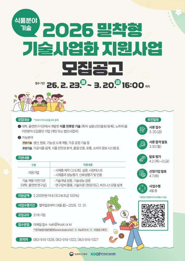 ÀÌ¿¡ ³óÁø¿øÀº ÇöÀåÀÇ ÀÌ °°Àº ¾î·Á¿òÀ» ÇØ¼Ò°íÀÚ Áö¿ø ü°è ±¸Ãà¿¡ Âø¼öÇß´Ù. ´ë»óÀº ´ëÇаú ¿¬±¸ ±â°üÀÌ º¸À¯ÇÑ ½Äǰ °ü·Ã ƯÇã¿Í ½Ç¿ë½Å¾È(Ãâ¿ø ¶Ç´Â µî·Ï) µî ½Äǰ »ê¾÷ Àü¡¤ÈÄ¹æ ±â¼úÀ» ÀÌÀü¹Þ¾Æ °è¾àÀÌ À¯Áö ÁßÀÎ °³ÀÎ ¶Ç´Â ¹ýÀλç¾÷ÀÚ´Ù. ÀÌÈÄ ³óÁø¿øÀº 31°³ »ç¸¦ ¼±Á¤, ±â¾÷´ç ÃÖ´ë 2200¸¸ ¿ø À̳»ÀÇ »ç¾÷È ÀÚ±ÝÀ» Á¦°øÇÑ´Ù. ±â°£Àº 4¿ù 1ÀϺÎÅÍ 12¿ù 31ÀϱîÁö´Ù. ³óÁø¿øÀÌ µµ¿òÀ» ÁÙ ÁÖ¿ä ³»¿ëÀº ¢¹½ÃÁ¦Ç° Á¦ÀÛ°ú °íµµÈ ¢¹½ÇÁõ ¹× ½ÃÀå ¹ÝÀÀ Á¶»ç ¢¹¼º´É¡¤½Å·Ú¼º Æò°¡ ¢¹°¢Á¾ ÀÎÁõ Áö¿ø µîÀÌ´Ù. ƯÈ÷ ±â¼úÀ» °³¹ßÇϰųª ÀÌÀüÇÑ ´ëÇÐ ¹× ¿¬±¸ ±â°üÀÌ Á÷Á¢ Âü¿©ÇÏ´Â ¡®¿¬±¸½Ç ÄÁ¼³ÆÃ¡¯À» º´ÇàÇÑ´Ù.