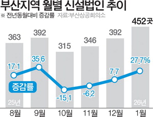 11ÀÏ ºÎ»ê»ó°øÈ¸ÀǼҴ ¡®2026³â 1¿ù ºÎ»êÁö¿ª ½Å¼³¹ýÀÎ ÇöȲ Á¶»ç¡¯ °á°ú¸¦ ¹ßÇ¥Çß´Ù. Á¶»ç¿¡ µû¸£¸é ¿ÃÇØ 1¿ù ºÎ»ê ½Å¼³¹ýÀÎ ¼ö´Â 452°³·Î Àü³â °°Àº ±â°£ ´ëºñ 27.7% Áõ°¡Çß´Ù. ÀÌ´Â ÃÖ±Ù 1³â Áß ÀúÁ¡À» ±â·ÏÇÑ Áö³ÇØ 10¿ù(315°³) ÀÌÈÄ 3°³¿ù ¿¬¼Ó Áõ°¡´Ù.