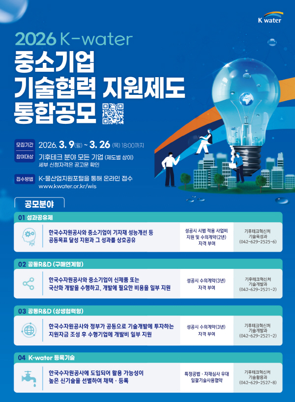 Çѱ¹¼öÀÚ¿ø°ø»ç(K-water)´Â Áö³­ 13ÀÏ ´ëÀü ¼±»þÀÎÈ£ÅÚ¿¡¼­ ¡®2026³â Áß¼Ò±â¾÷ ±â¼úÇù·Â Áö¿øÁ¦µµ ¼³¸íȸ¡¯¸¦ °³ÃÖÇß´Ù°í 16ÀÏ ¹àÇû´Ù.