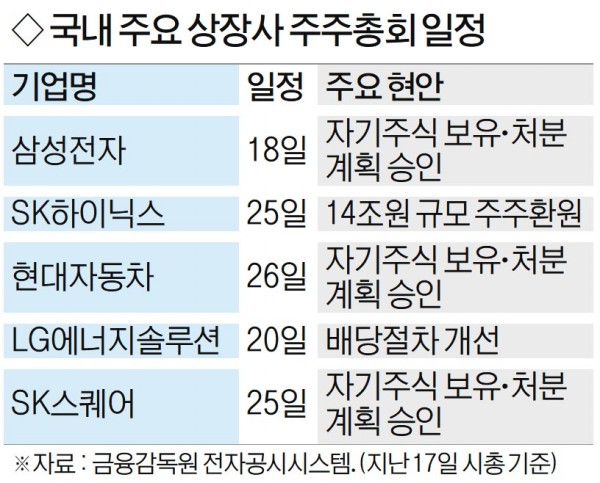 LG¿¡³ÊÁö¼Ö·ç¼ÇÀº ¿À´Â 20ÀÏ, Çö´ëÀÚµ¿Â÷´Â ¿À´Â 26ÀÏ, °æ³² â¿ø¿¡ º»»ç¸¦ µÐ ÇÑÈ­¿¡¾î·Î½ºÆäÀ̽º¿Í µÎ»ê¿¡³Êºô¸®Æ¼´Â °¢°¢ 24Àϰú 31ÀÏ, ¿ï»ê µ¿±¸¿¡ º»»ç¸¦ µÐ HDÇö´ëÁß°ø¾÷Àº 31ÀÏ ÁÖÃÑÀ» ¿¬´Ù. ÇÑÈ­¿¡¾î·Î½ºÆäÀ̽º´Â Á¤°üÀ» °³Á¤ÇØ ¿¡³ÊÁö ºÐ¾ß µîÀ» »ç¾÷ ¸ñÀû¿¡ Ãß°¡ÇÒ ¿¹Á¤ÀÌ´Ù. ÀÏÁ¤ ±Ô¸ð ÀÌ»óÀÇ ´ë±â¾÷µéÀº À̹ø ÁÖÃÑ¿¡¼­ °³Á¤ »ó¹ý¿¡ µû¶ó »ç¿ÜÀÌ»ç ¸íĪÀ» µ¶¸³ÀÌ»ç·Î ¹Ù²Ù°í ÁýÁßÅõÇ¥Á¦(2ÀÎ ÀÌ»ó ÀÌ»ó ¼±Ã⠽à ÁÖ´ç Àǰá±ÇÀ» ÇÑÂÊ¿¡ ¸ô¾Æ¼­ ÅõÇ¥ÇÒ ¼ö ÀÖÀ½) µµÀÔÇØ¾ß ÇÏ¸ç °¨»çÀ§¿ø µ¶¸³¼º °­È­ µîÀ» Á¤°ü¿¡ ¹Ý¿µÇØ¾ß ÇÑ´Ù.